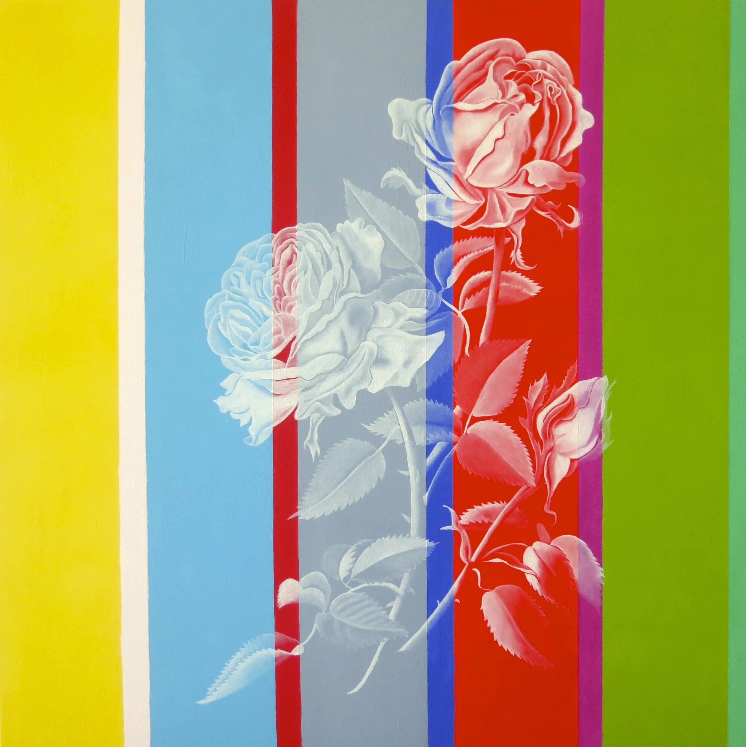 This floral series centers on the rose—long regarded as a symbol of beauty, mystery, and the highest energetic vibrational frequency found in nature. The Colors of Flower concept was born from a deep observation of the extraordinary complexity in the hues required to truly capture a single bloom. To explore this visually, the pigments traditionally used to depict the flower are abstracted into vertical stripes in the background, while the flowers themselves are rendered in the absence of color—inviting the viewer to sense their presence beyond the visible spectrum.